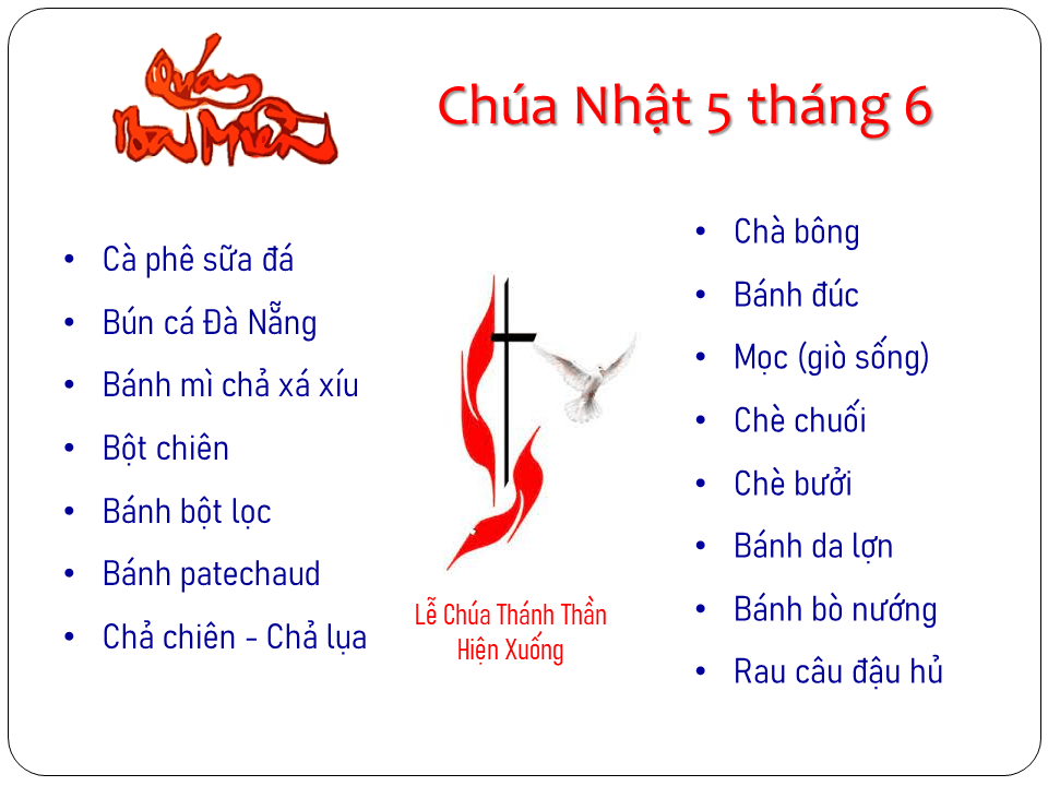 Ngày Lễ Chúa Thánh Thần Hiện Xuống là Bổn Mạng của Hội Thánh Linh. Cha Chánh Xứ, Quý Tu Sĩ Nam Nữ, và toàn thể cộng đoàn giáo xứ xin gửi lời chúc mừng đến Hội Thánh Linh, nguyện xin Chúa Thánh Thần ban thêm sức mạnh và những ơn cần thiết cho từng thành viên trong Hội để các anh chị trở thành những chứng nhân và các tín hữu nhiệt thành của Giáo Hội.