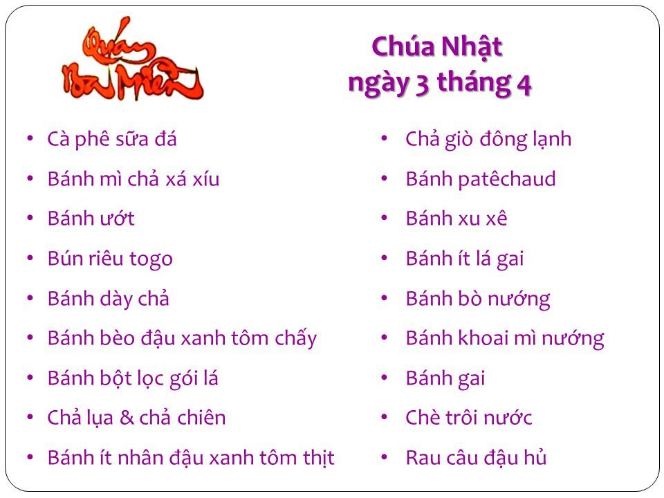 Sau Thánh Lễ sáng 7:45 am, kính mời quý anh chị em đến ủng hộ Quán. Thực đơn CN 3/4