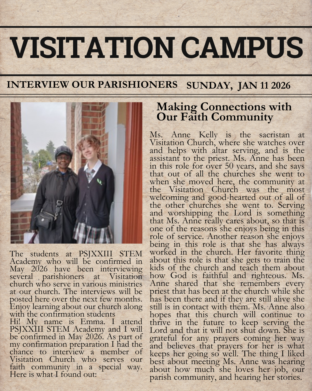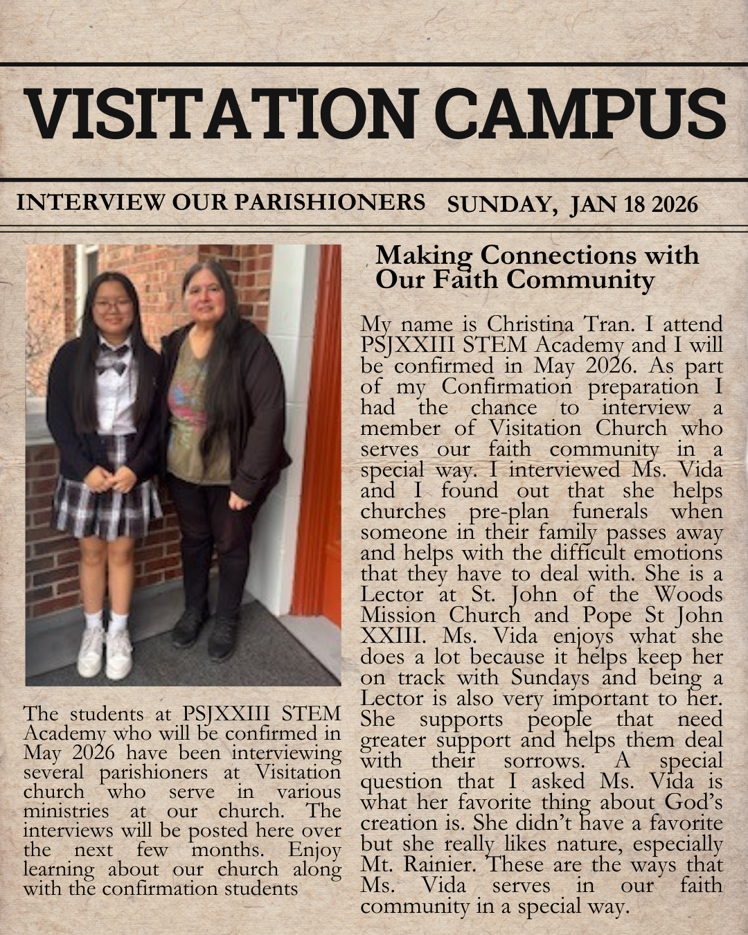 The people of Visitation have not lost sight of that admonition. The Church of the Visitation retains the vision of the original seven and remains an institution reaching out and welcoming all who come to share its celebration of God’s love.