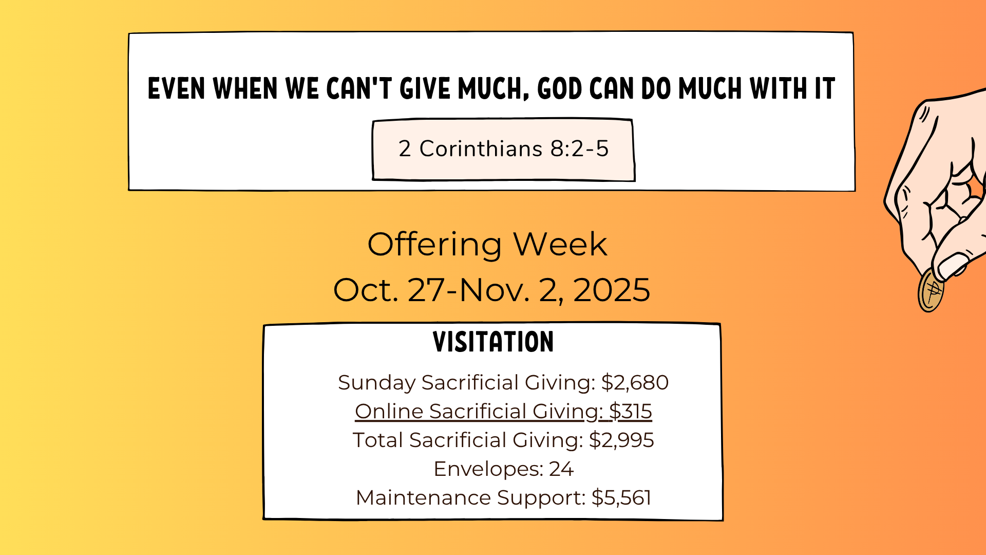 The Sunday collection is very important for us to maintain our fiscal responsibilities. So, if you are away on a Sunday, ENJOY; but, remember YOUR church. Set up your gift today or consider an additional gift via our Online Giving at link below:
