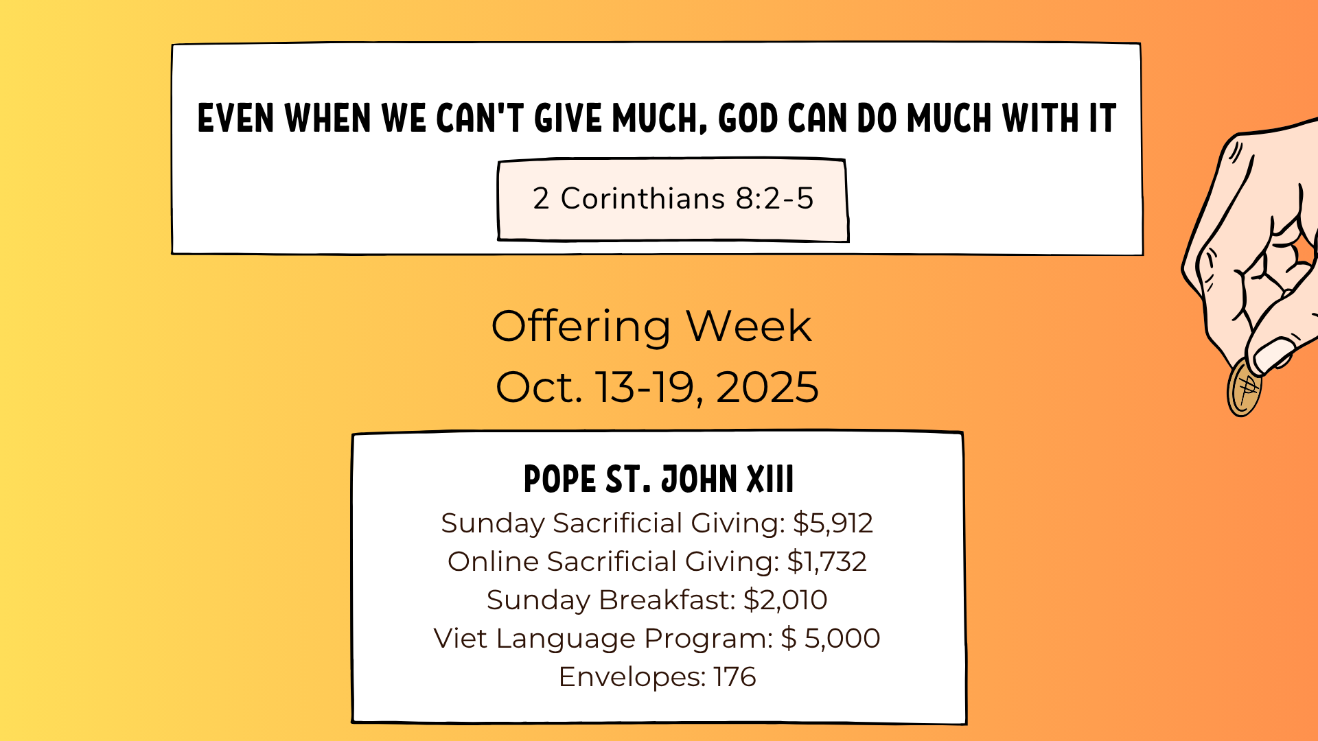 As we begin our annual focus on the Stewardship of Treasure, we invite you to take a moment to reflect on how God has blessed you over the past year. This week, you will receive a letter from Fr. Tuan encouraging you to consider how you might return a portion of those blessings to our parish community.
