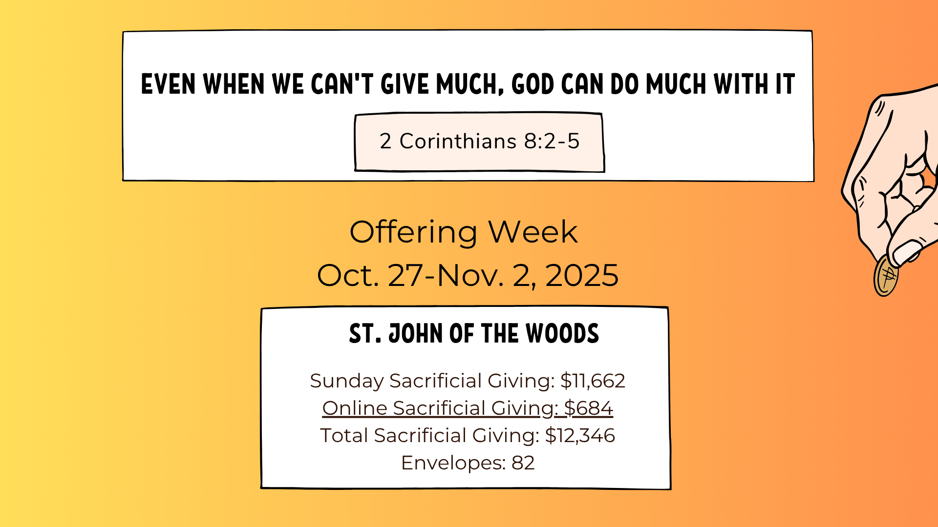 The Sunday collection is very important for us to maintain our fiscal responsibilities. So, if you are away on a Sunday, ENJOY; but, remember YOUR church. Set up your gift today or consider an additional gift via our Online Giving at link below: