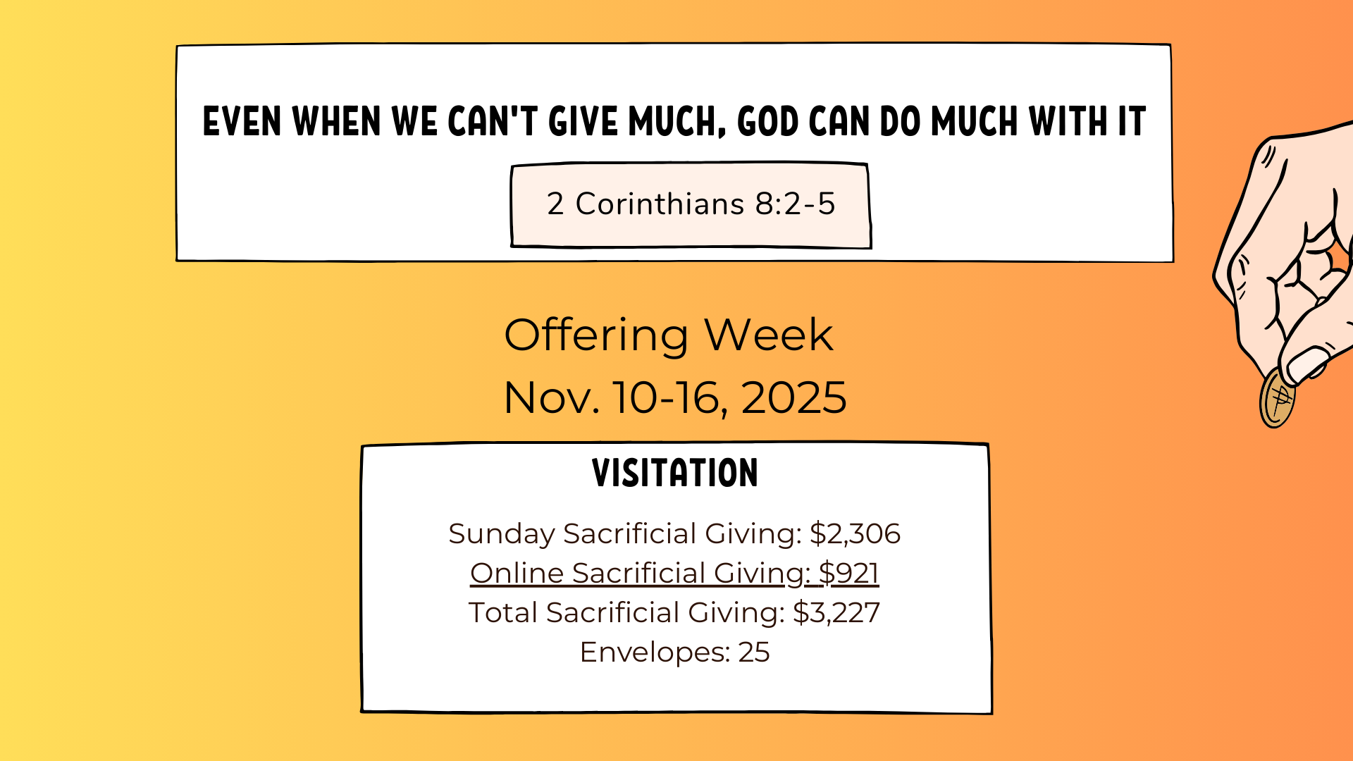 The Sunday collection is very important for us to maintain our fiscal responsibilities. So, if you are away on a Sunday, ENJOY; but, remember YOUR church. Set up your gift today or consider an additional gift via our Online Giving at link below: